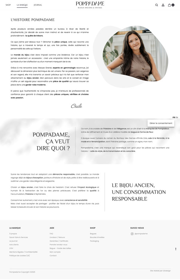 Création d’un site internet e-commerce pour une nouvelle marque. Pompadame propose la vente de bijoux anciens et vintage en or 18 carats.